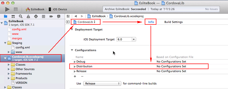 3. 上述步驟是網路上查的排除方式,但那是直接使用Xcode直接撰寫cordave編譯的解決方式,還記得我們是用Hybrid App來開發嗎? Visual Studio早就設定好此步驟了,因此上述的方法是行不通的,我們在回頭觀察一下產生出來的專案檔,存在一個【cordovaLib.xcodeproj】的子專案檔,打開專案檔觀察一下,在上面的步驟我們加入了一個Distribution的config項目,但是在這個子專案並沒有調整到,因此在建置實機發佈檔後對應不起來,而發生了錯誤,請在此子專案config檔建立相同的步驟,接著清除(Product ->Clean)後重新建置(Product -> Archive)即可排除此問題。