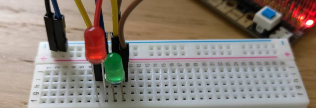 micro:bit 的腳位:P3、P4、P6、P7、P9、P10 是與板子上的 LED 燈陣列共用,所以平常沒事最好別用它們。P5 與 P11 分別和按鈕 A/B 共用,P19 與 P20 是 I2C 腳位。所以正常下能直接使用的腳位就是 P0-P2、P8、P12–16。(若要使用 SPI,就會用到 P13–15。) micro:bit 腳位的輸出電壓為 3.3V,最大輸出電流 5 mA(因此就算不用電阻,直接接 LED 也絕不會燒壞)。3V 腳位可輸出的電流至多 90 mA,這對一般外接元件而言夠用了,但要拿來驅動馬達之類的裝置就會比較困難。